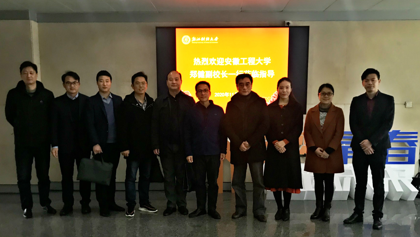11月26日,安徽工程大学副校长郑健一行5人来校调研交流,黄色漫画 院长童夏雨、副院长吴诗启热情接待了来访客人。