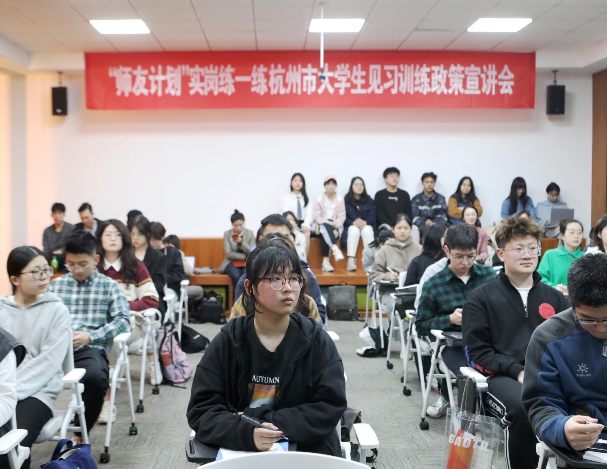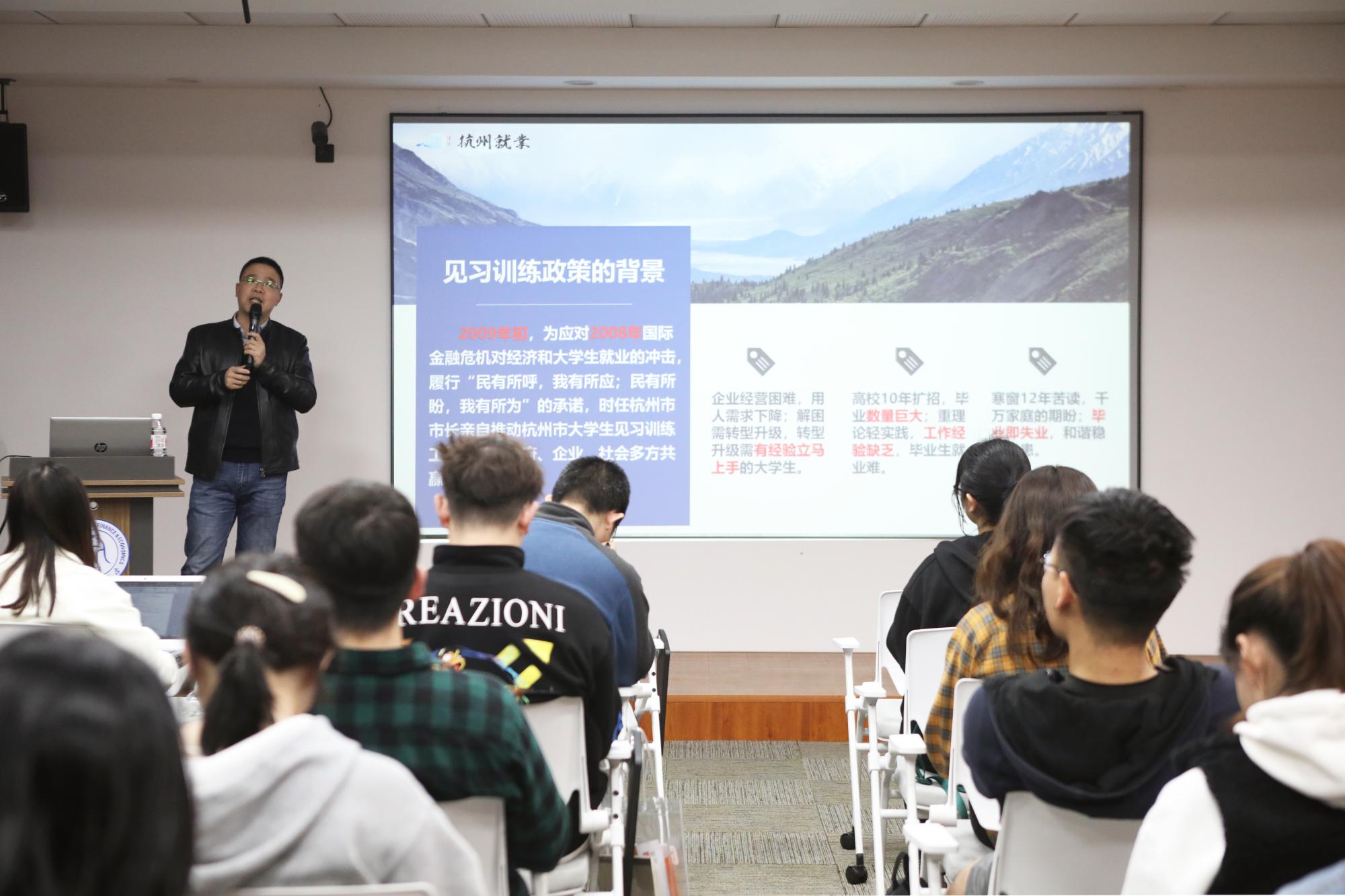 肖处长提到,大学生见习训练是促进大学生就业的帮扶政策,其目的是通过政府补贴促进学生就业政府补贴,是政府、企业、高校参与大学生就业创业,并实现共赢的有效途径和方式。同时,肖处长表示,见习对象是面向所有在杭全日制普通高校毕业生学年学生,见习训练有补贴,导师按计划带教,提升专业各项技能,表现优异者可以直接录用正式入职,让同学们可以提前进入工作岗位锻炼,了解企业精神和文化,提高自身的综合素养和业务能力,为走上社会磨好宝剑。